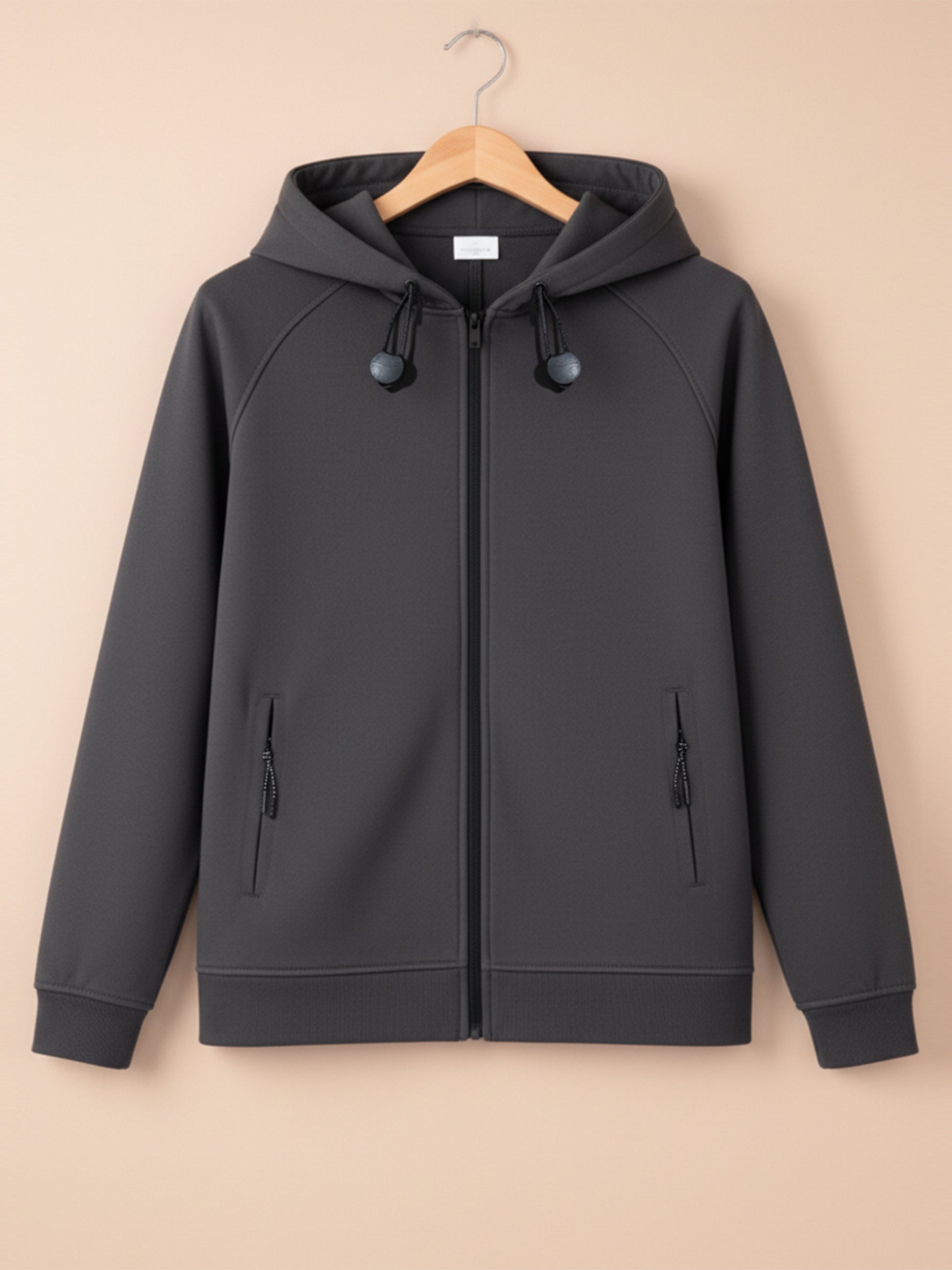 Crafted from a premium polyester german fleece, it offers warmth and breathability in equal measure. The full-length zipper, adjustable drawstring hood, and ribbed cuffs and hem provide a secure, comfortable fit. Dual side pockets keep your essentials close at hand while maintaining a clean silhouette.
