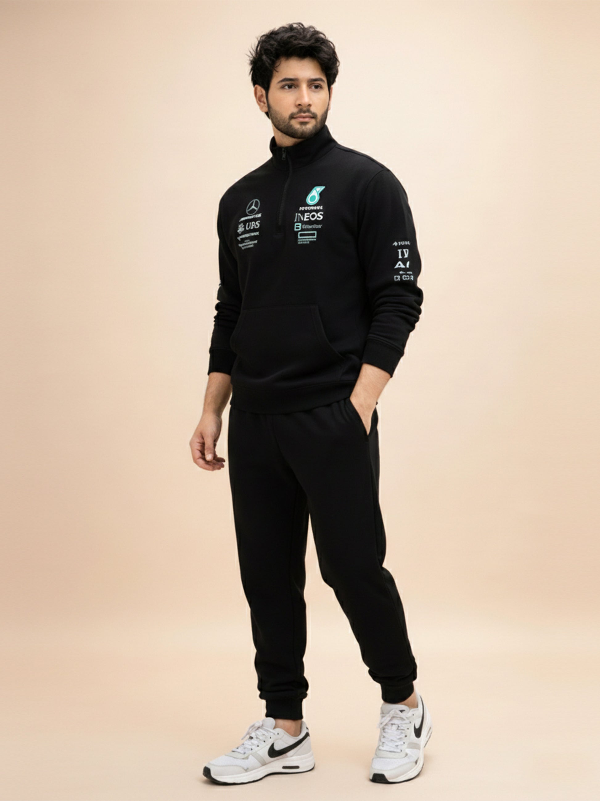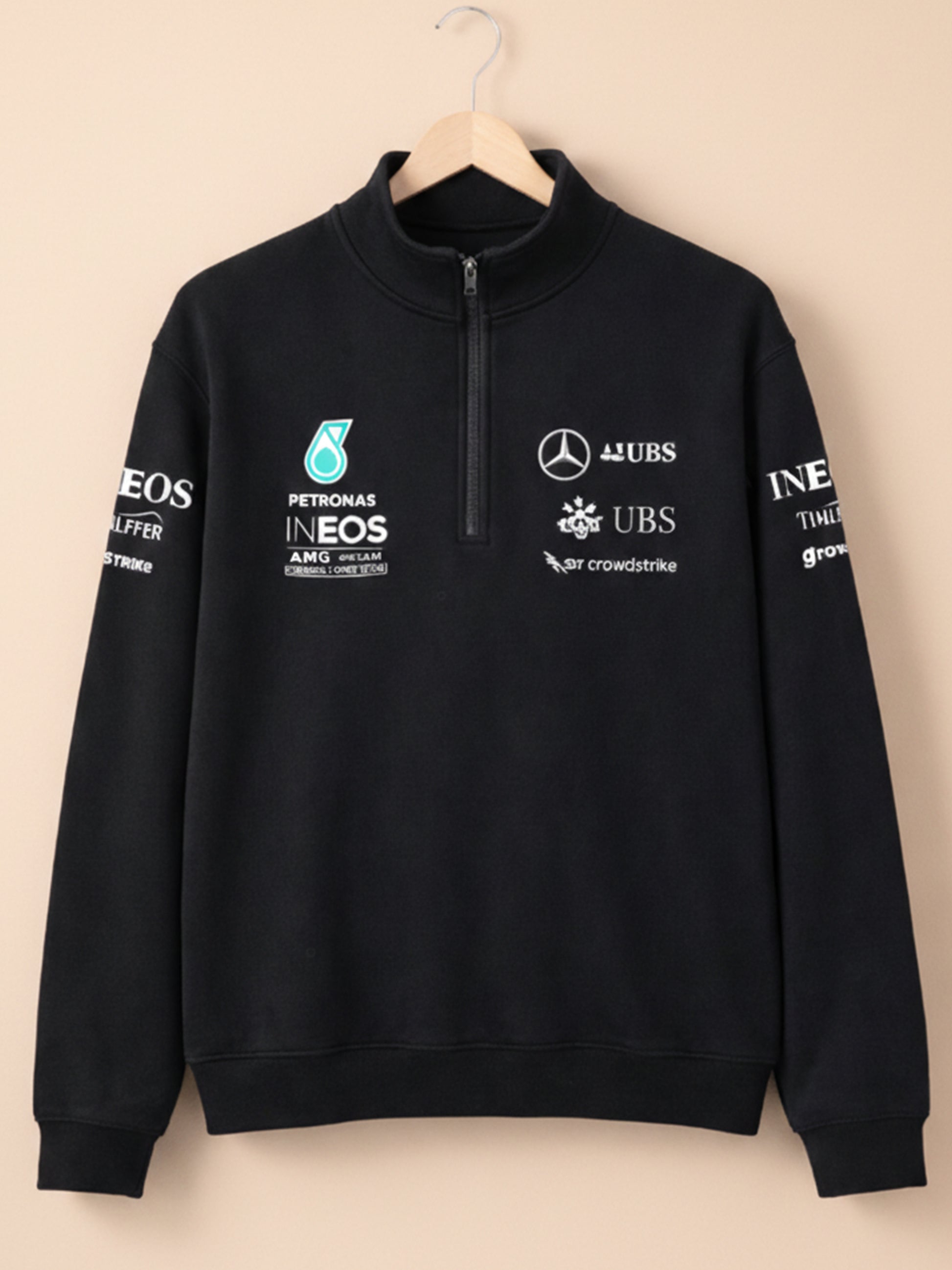 Mercedes Premium Half Zipper Jacket featuring sponsor logos and team branding. This comfortable Half Zipper Jacket is perfect for motorsport enthusiasts and fans who want to showcase their passion for racing.