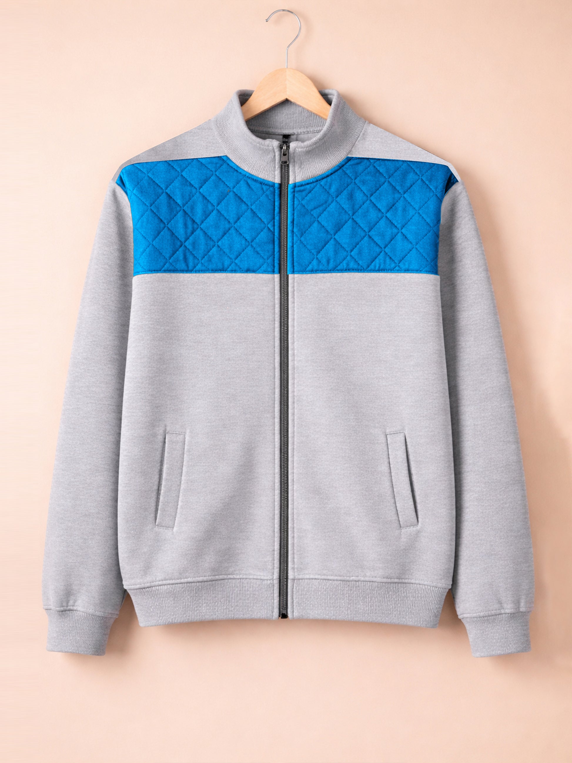 Elevate your athleisure game with this premium quilted track jacket. Featuring a bold grey and blue colorblock design with a distinctive diamond-quilted chest panel, this jacket combines retro-inspired styling with contemporary comfort for a look that transitions seamlessly from the gym to the street.