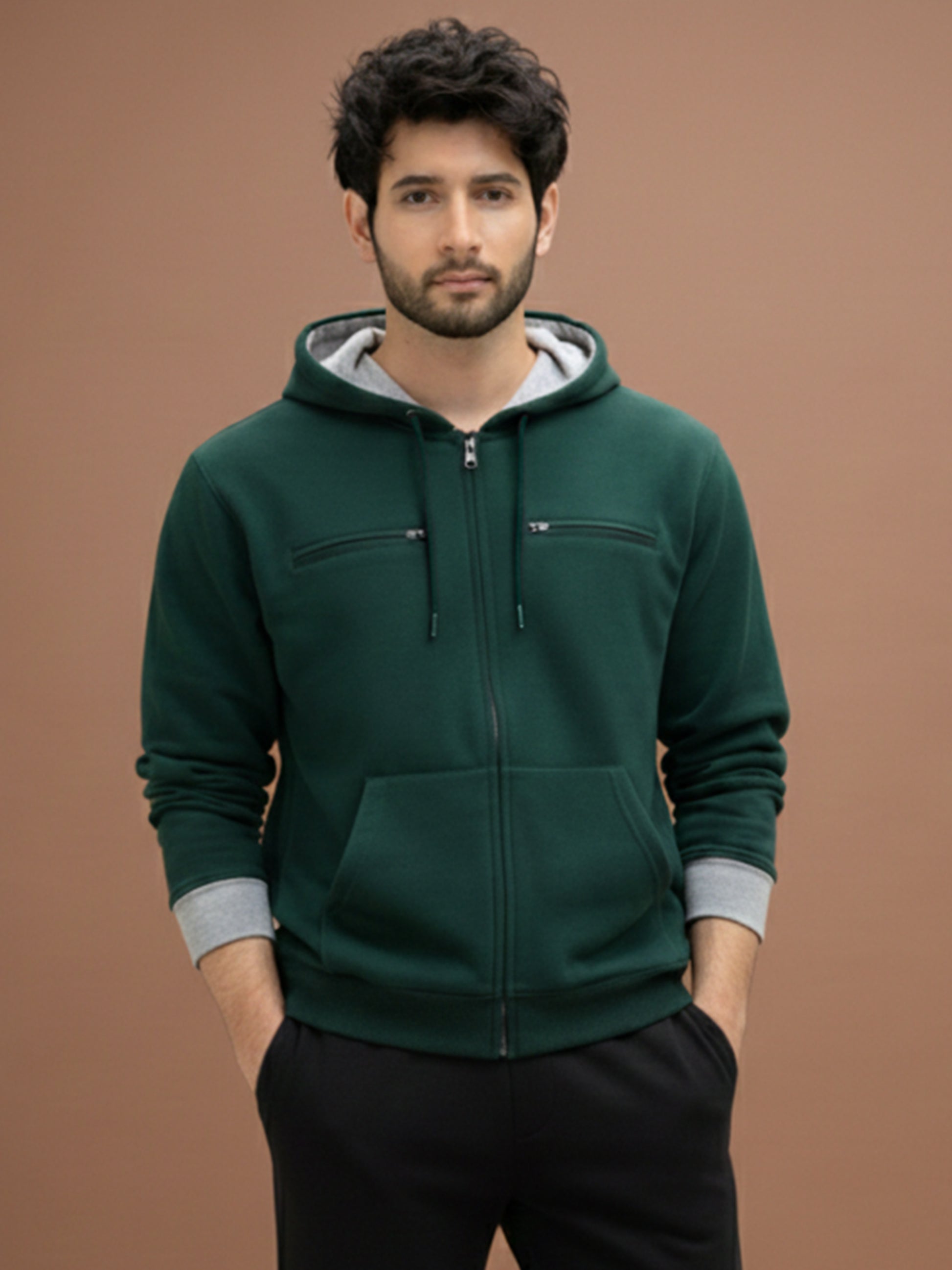 Elevate your casual wardrobe with this premium Bottle Green zip-up hoodie. Designed for everyday comfort and versatile styling, this hoodie features a soft fleece interior, full-length zipper, and a contrasting grey hood lining for a modern, sporty aesthetic.
