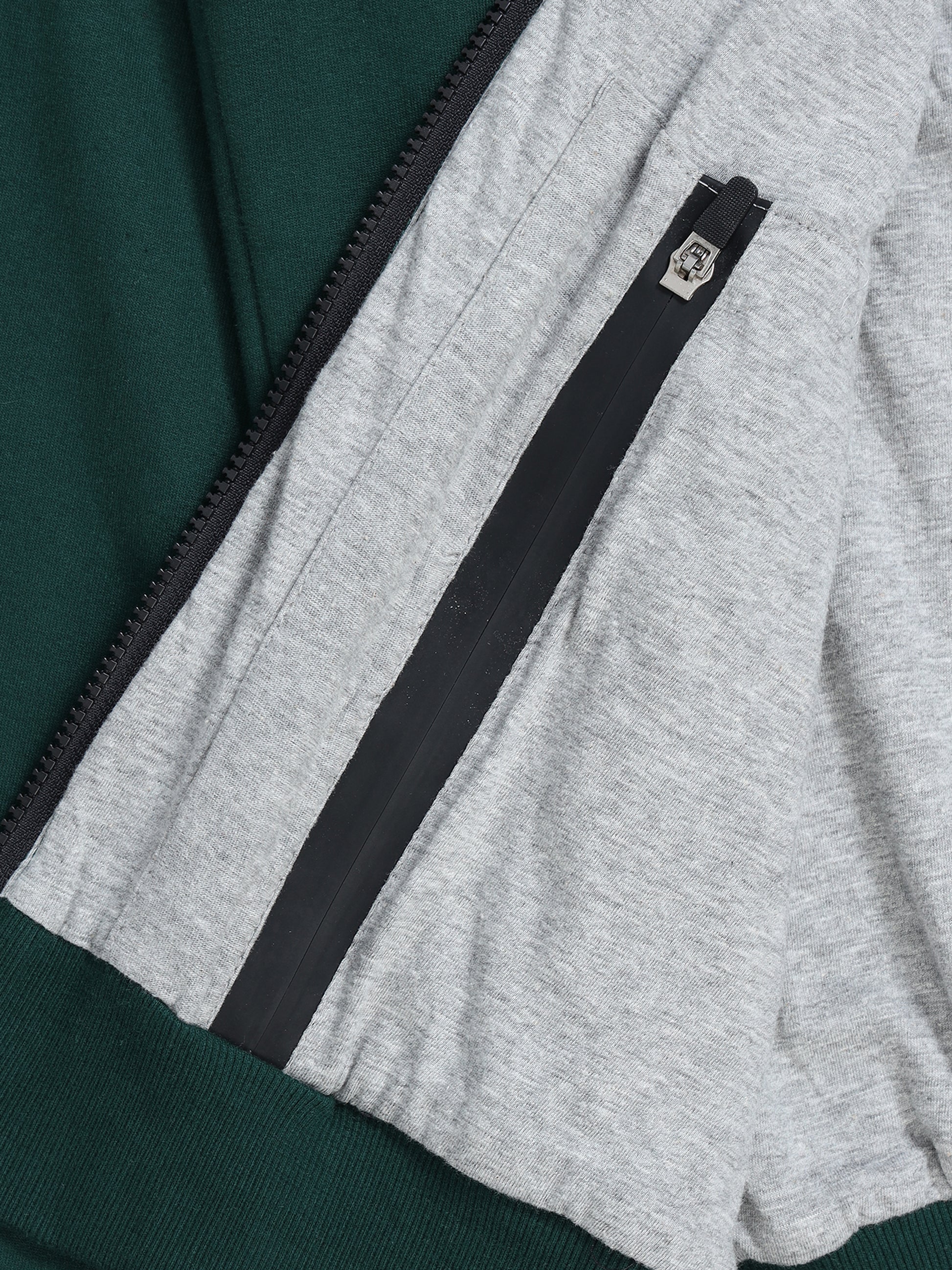 - Details: Full zipper, dual chest zip pockets, kangaroo pocket, grey contrast hood lining and cuffs, ribbed hem